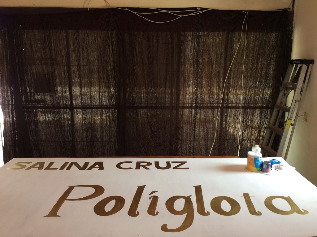 Nohemy pinta el icónico letrero de Salina Cruz Políglota.